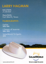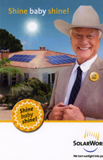 Join Larry in his support of alternative and solar energy by purchasing this SolarWorld tote bag. Larry was their company spokesperson. Measures approximately 12 inches by 13 inches. While supplies last, the tote bag also comes with a 4x6 full color postcard featuring Larry on the front with film credits on the back, and an 8½x5½ full color postcard featuring Larry on the front along with his pre-printed signature in blue, and a photo of his airstream RV on the back, (see images below). Also included in limited quanities, are a Shine baby shine! sticker, button and magnet; and a SUN AT WORK SOLARWORLD sticker.